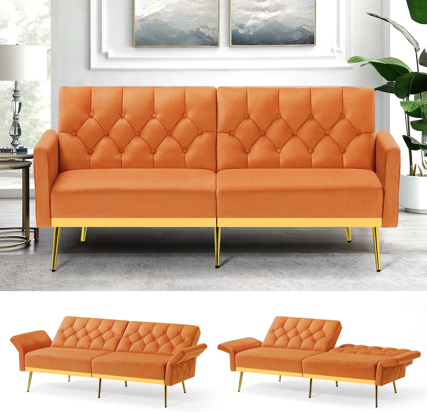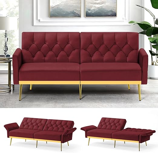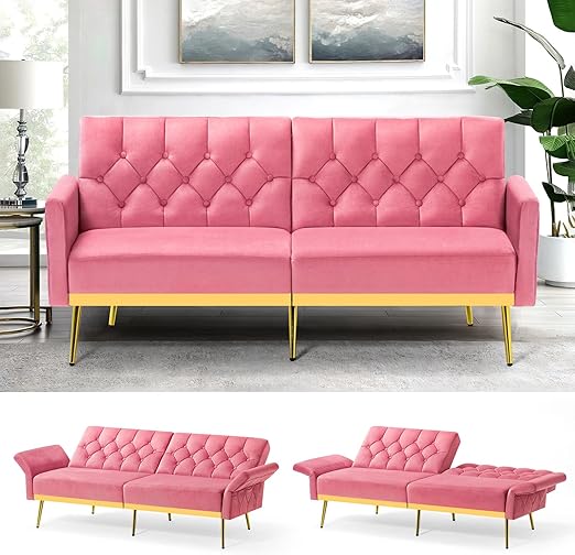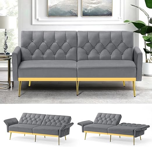 Velvet Futon Sofa Bed with Adjustable Armrests