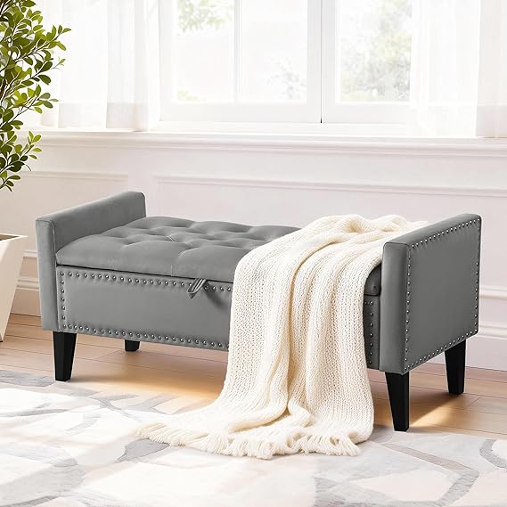 This upholstered storage bench features premium velvet fabric for a smooth touch and elegant finish. Perfect as an end of bed bench or storage ottoman, it combines seamless comfort with functional beauty for your bedroom, living room, or entryway.