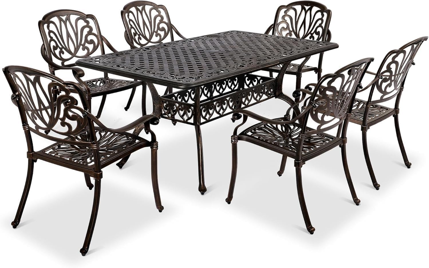 VINGLI 7-Piece Outdoor Dining Set, Cast Aluminum Patio Furniture Set for 6 with Umbrella Hole, Rectangular Outdoor Dining Table & 6 Stackable Chairs, All-Weather Garden/Poolside Dining Set Bronze
