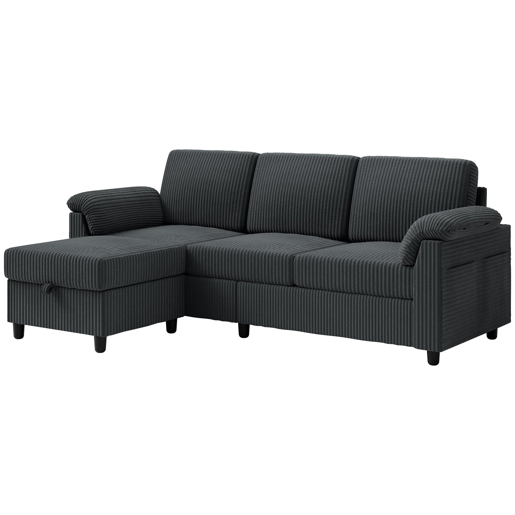This modern convertible sectional sofa features soft corduroy fabric upholstery with a durable hardwood frame. The comfortable design includes removable cushions, reinforced back support, and a movable ottoman for versatile room configurations.