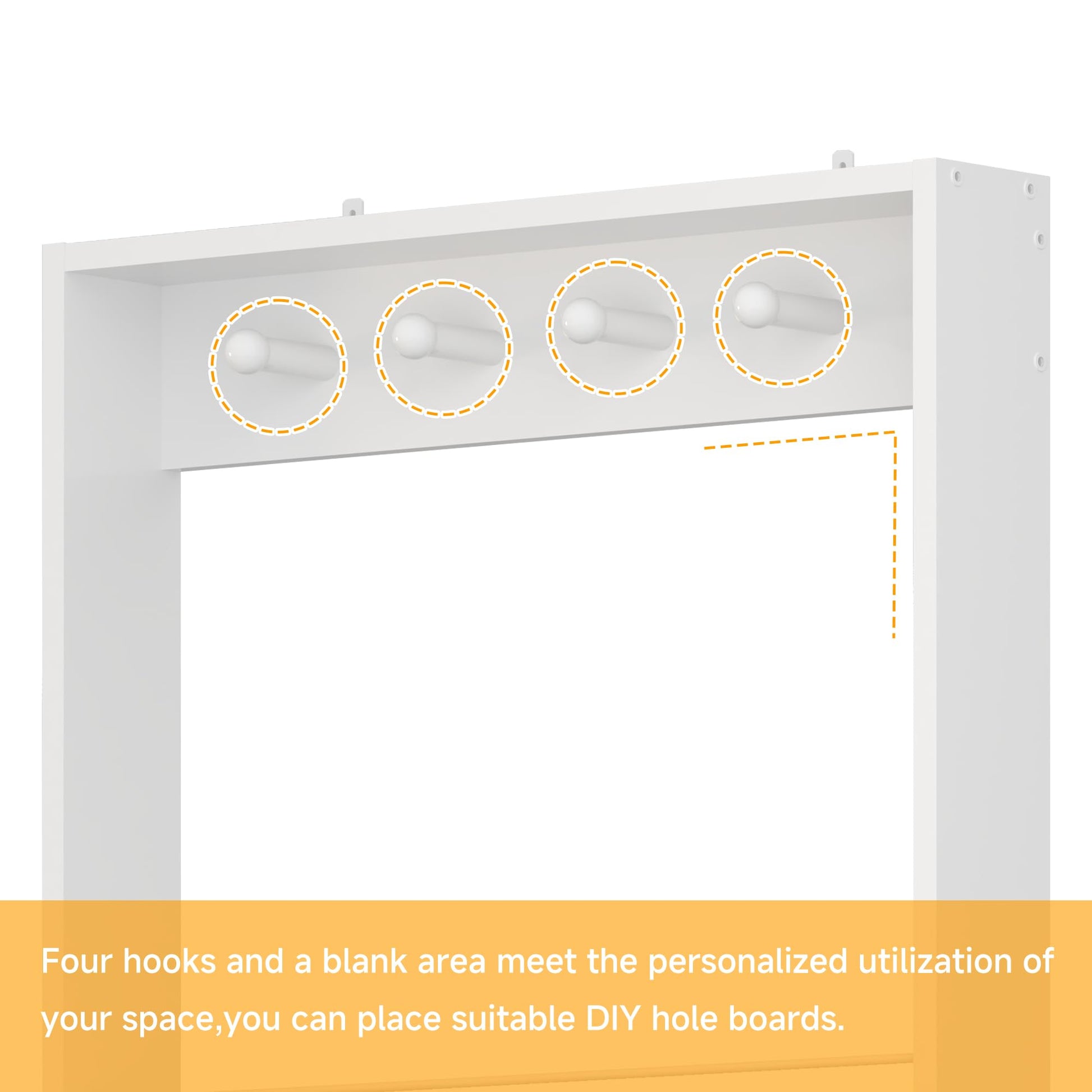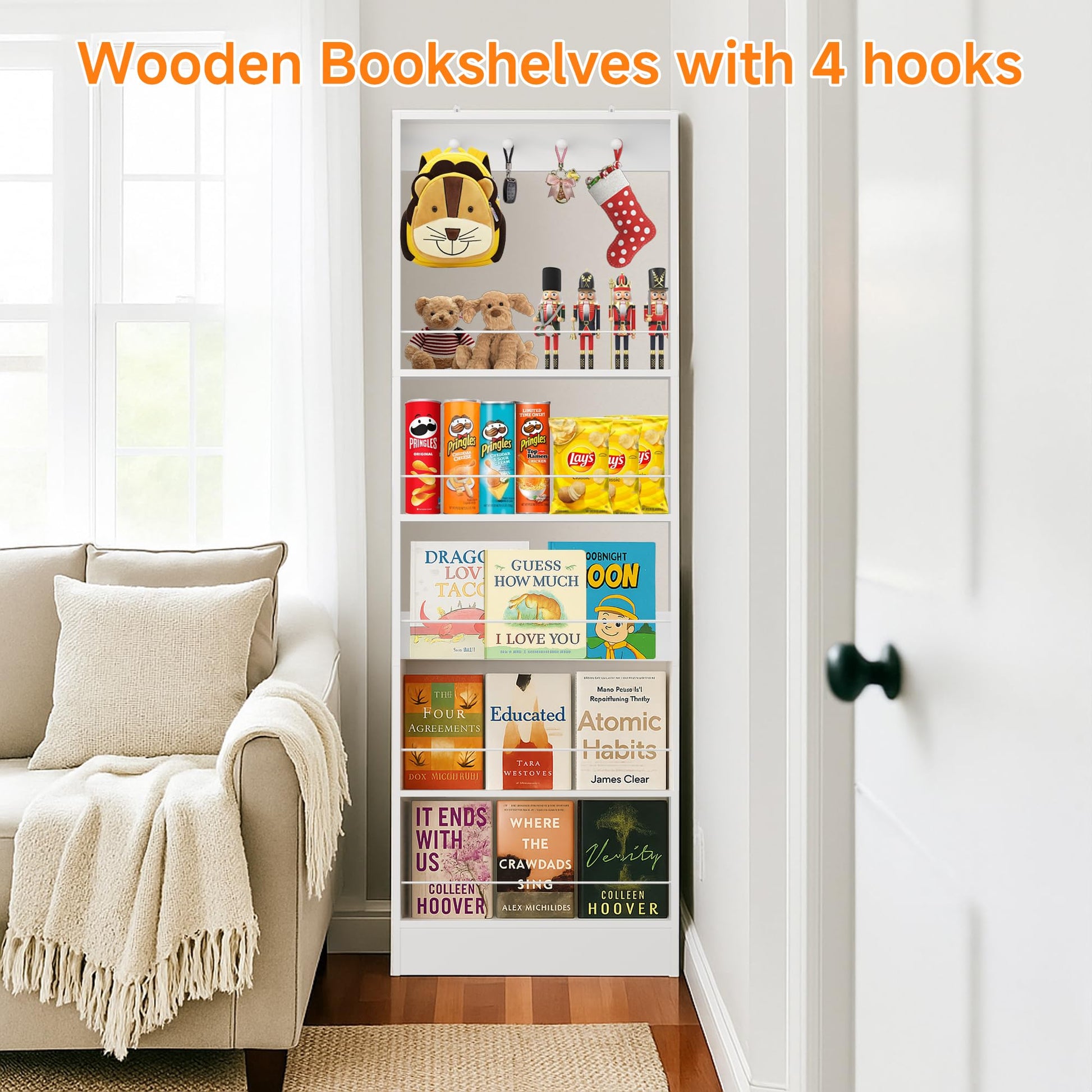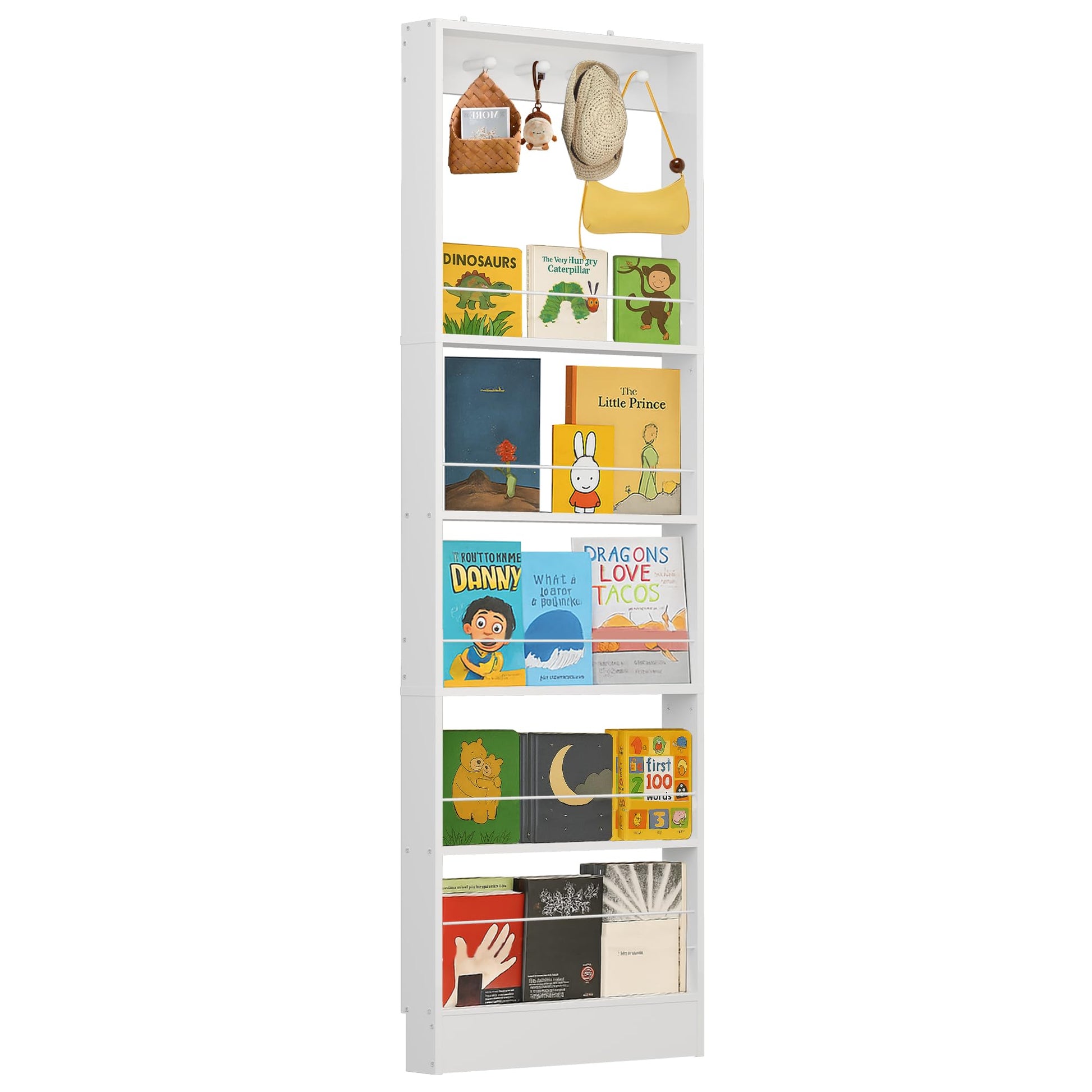 - Versatile 5-Tier Storage: Featuring five spacious tiers offering ample storage for story books, toys, decorations, kitchen utensils, spices, or beauty products. Includes four large wooden hooks and a blank DIY area for added functionality and personalization.