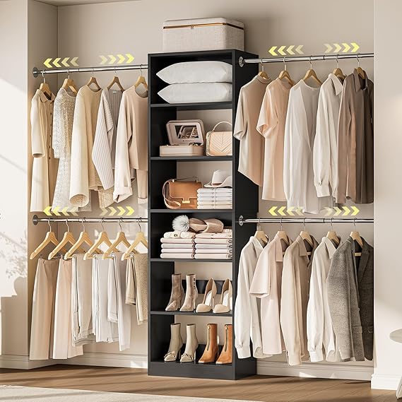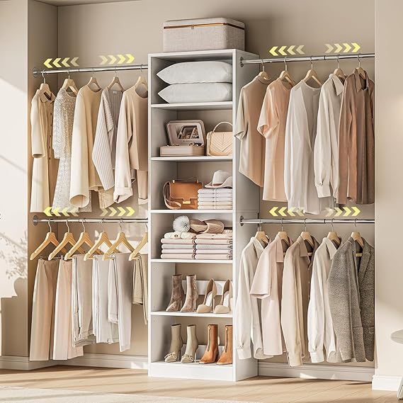 This closet organizer system is designed for easy wall installation and offers complete customization to fit your storage needs. The telescopic rods extend to accommodate different closet widths, while the adjustable shelves can be positioned at various heights to store clothing, shoes, accessories, and more.