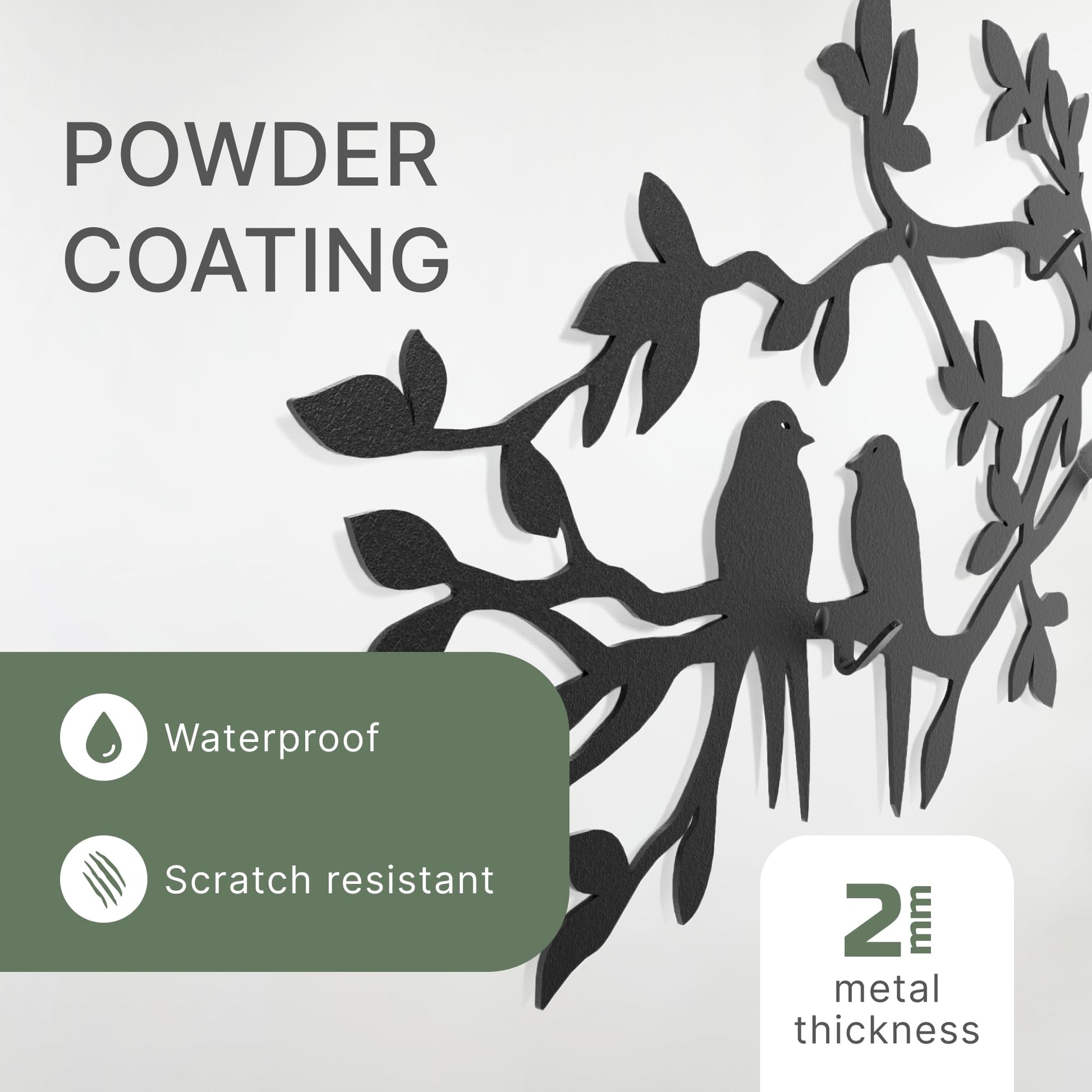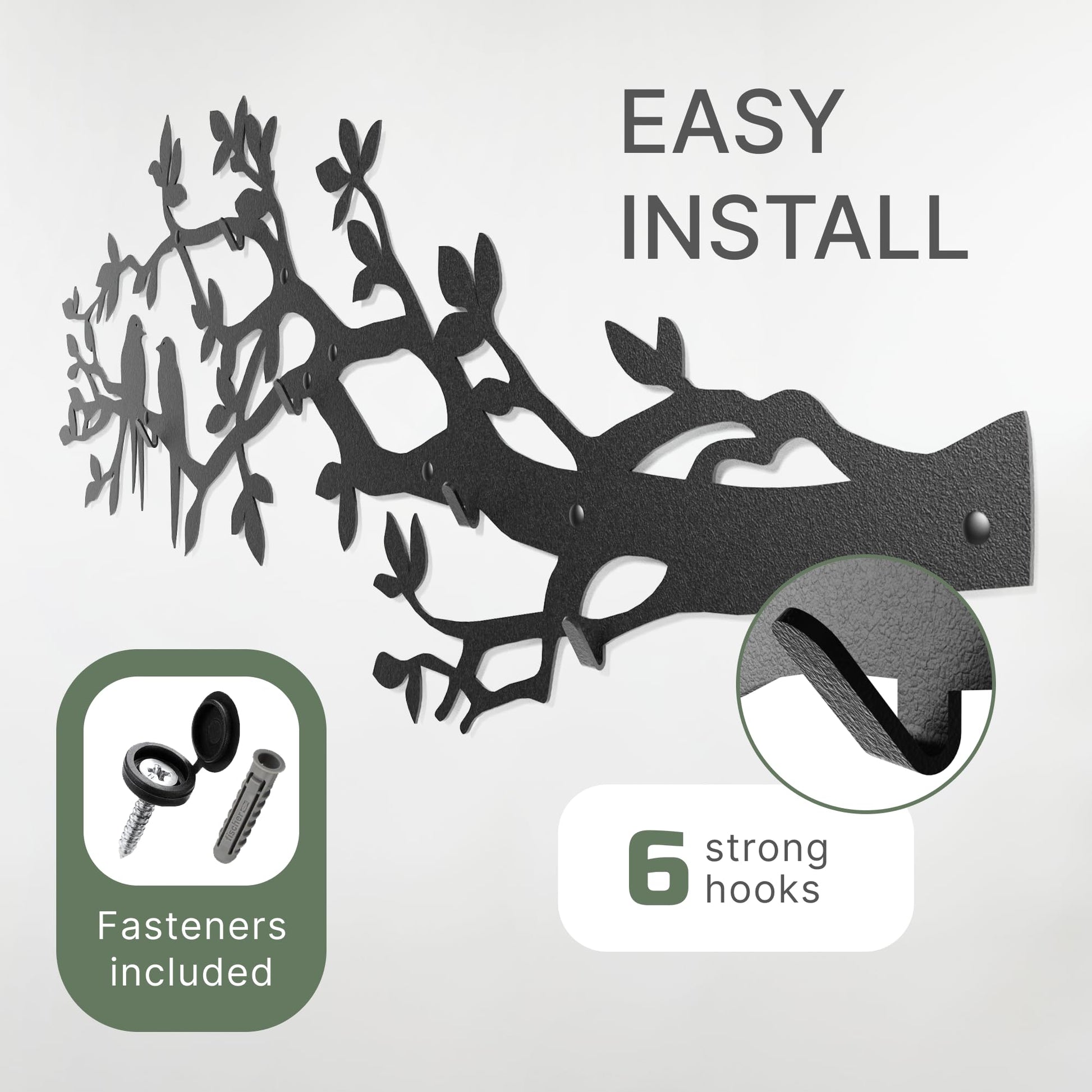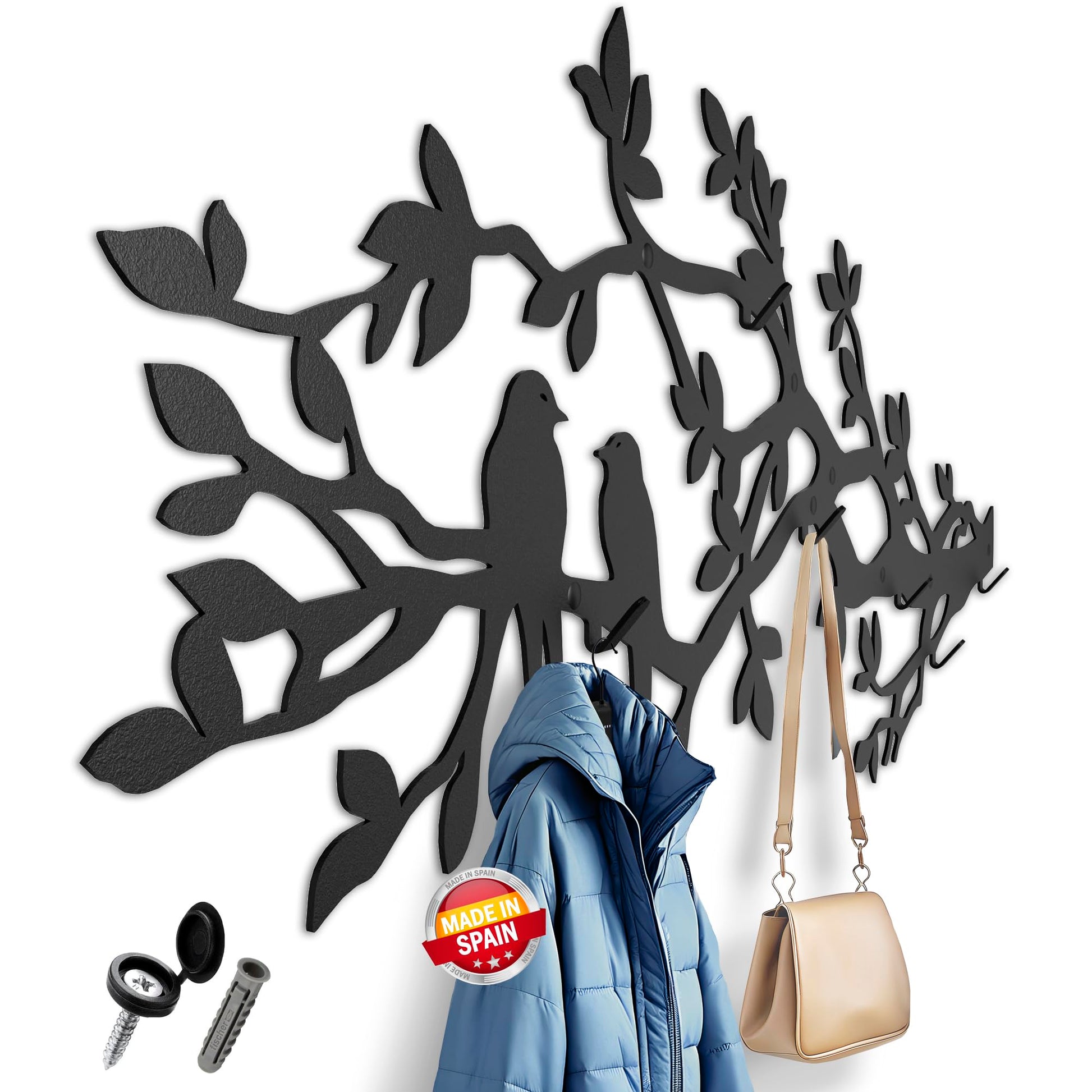 This decorative wall-mounted coat rack features a unique tree branch design with birds, combining functionality with modern artistic appeal. The heavy-duty metal construction provides reliable storage for coats, jackets, hats, and accessories while serving as an eye-catching wall decoration.
