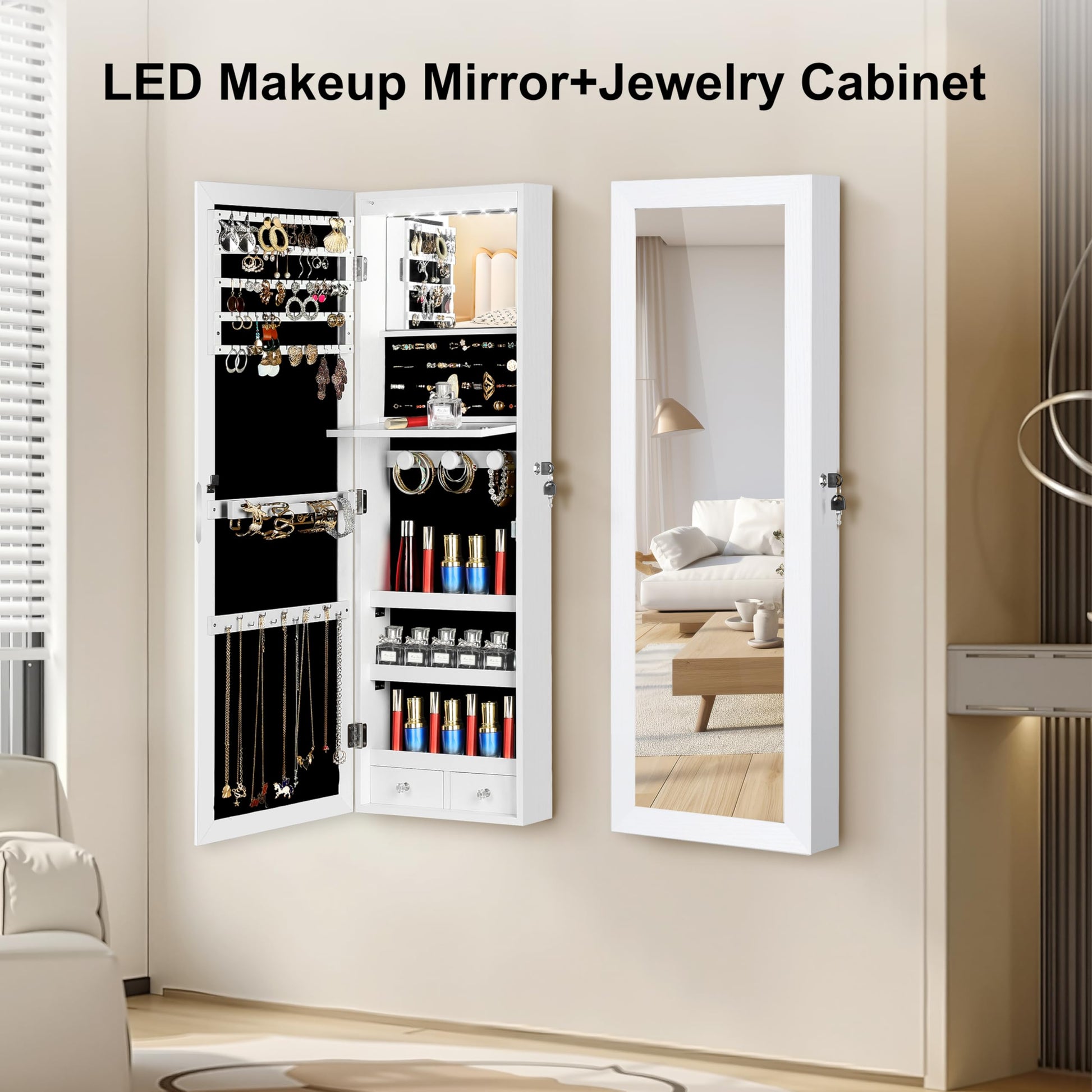 Transform your jewelry storage with this elegant wall-mounted jewelry armoire featuring a full-length mirror and LED interior lighting. This versatile organizer can be mounted on walls or doors, providing convenient access to your jewelry collection while maximizing space efficiency.