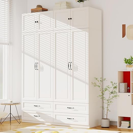 This modern armoire wardrobe closet combines elegant design with exceptional functionality, offering a comprehensive storage solution for bedrooms, guest rooms, or walk-in closets. The sleek white finish with black metal handles creates a sophisticated look that complements various interior styles.