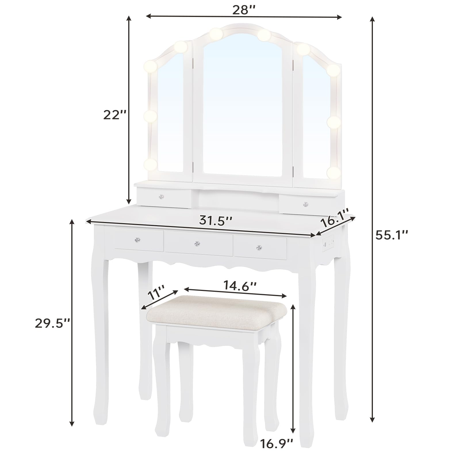 | Includes | Vanity Table, Tri-Fold Mirror, Stool |