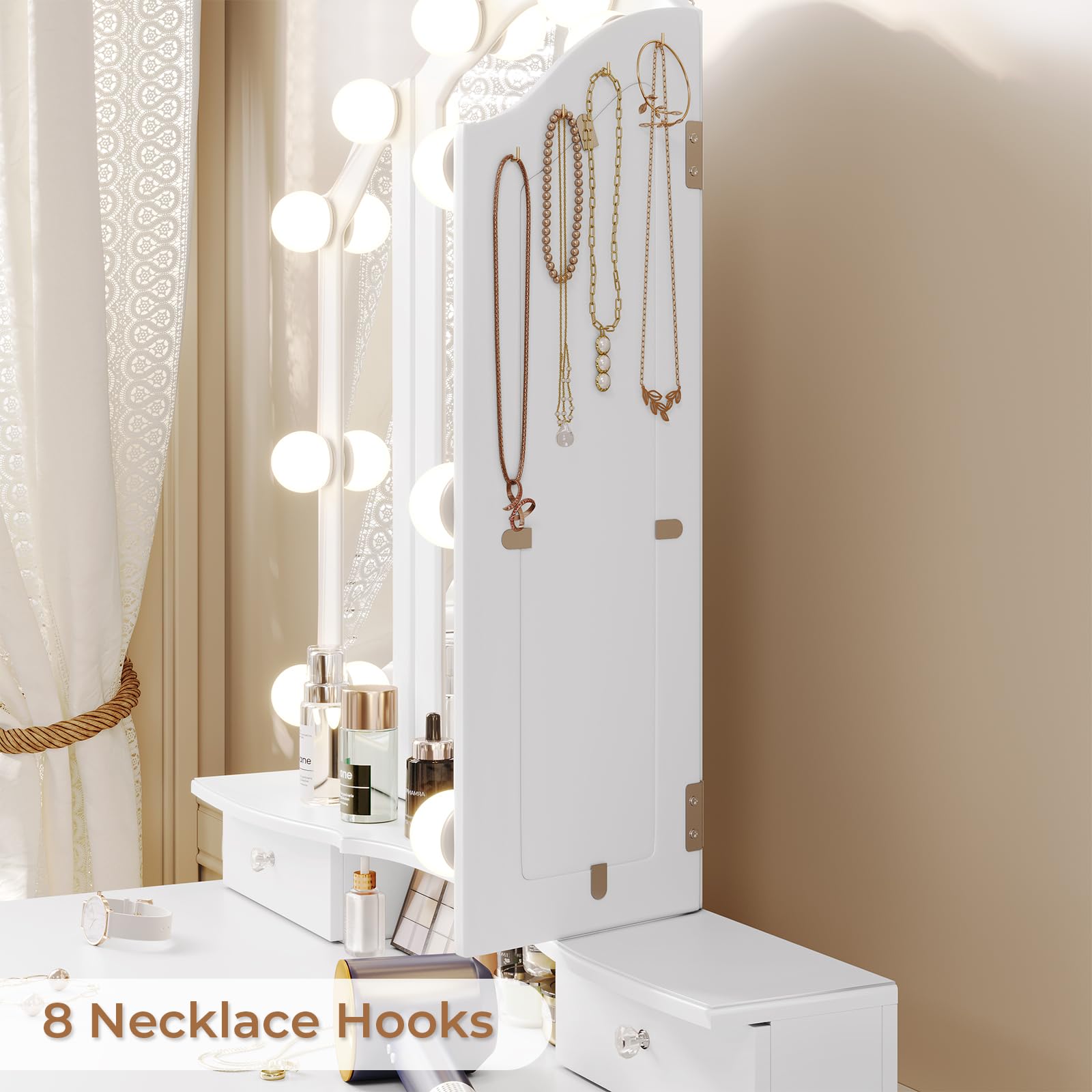 - Integrated necklace hooks for jewelry organization