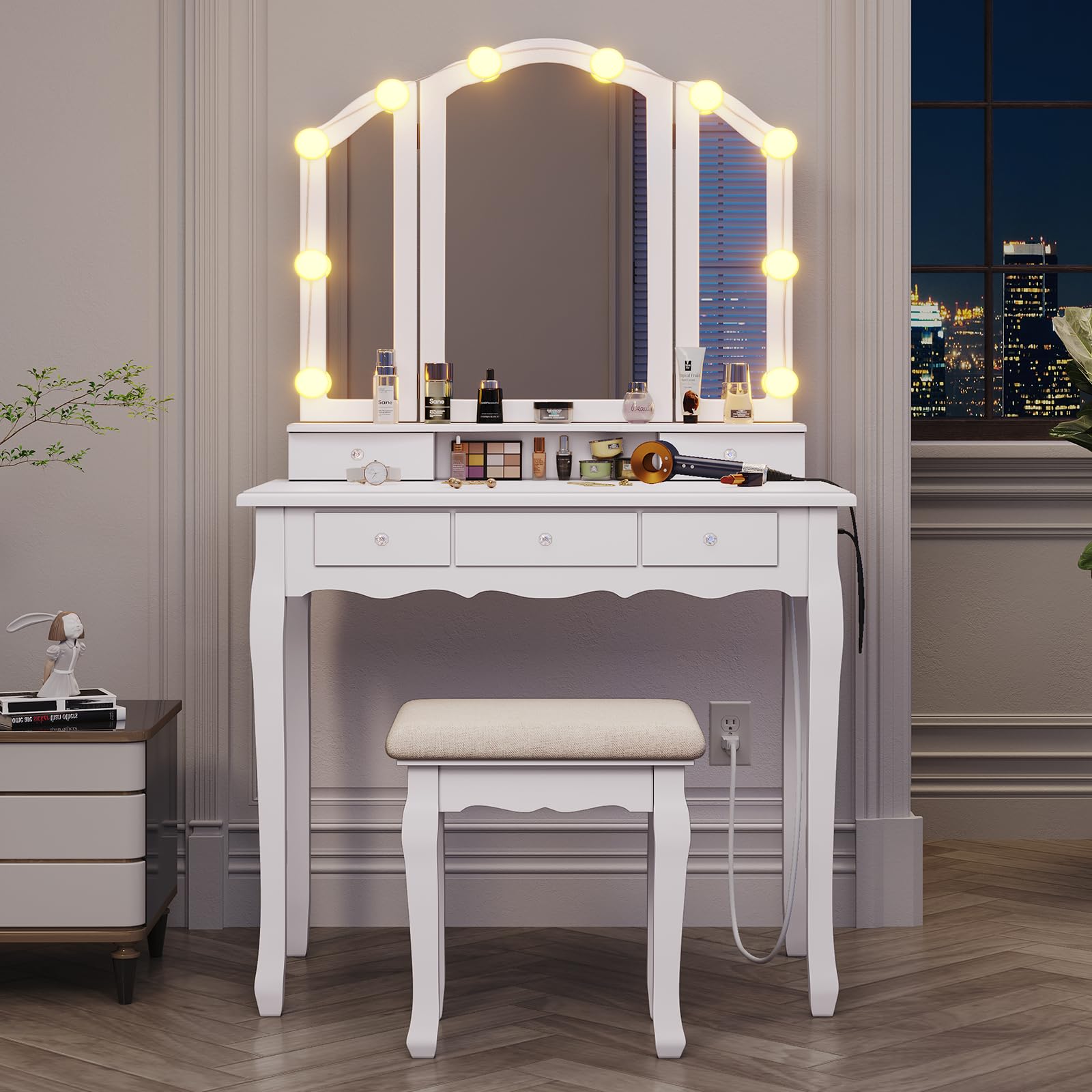 Transform your beauty routine with this elegant white makeup vanity featuring integrated lighting and a convenient charging station. The tri-fold mirror design provides optimal viewing angles, while three adjustable lighting modes ensure perfect illumination for makeup application at any time of day.