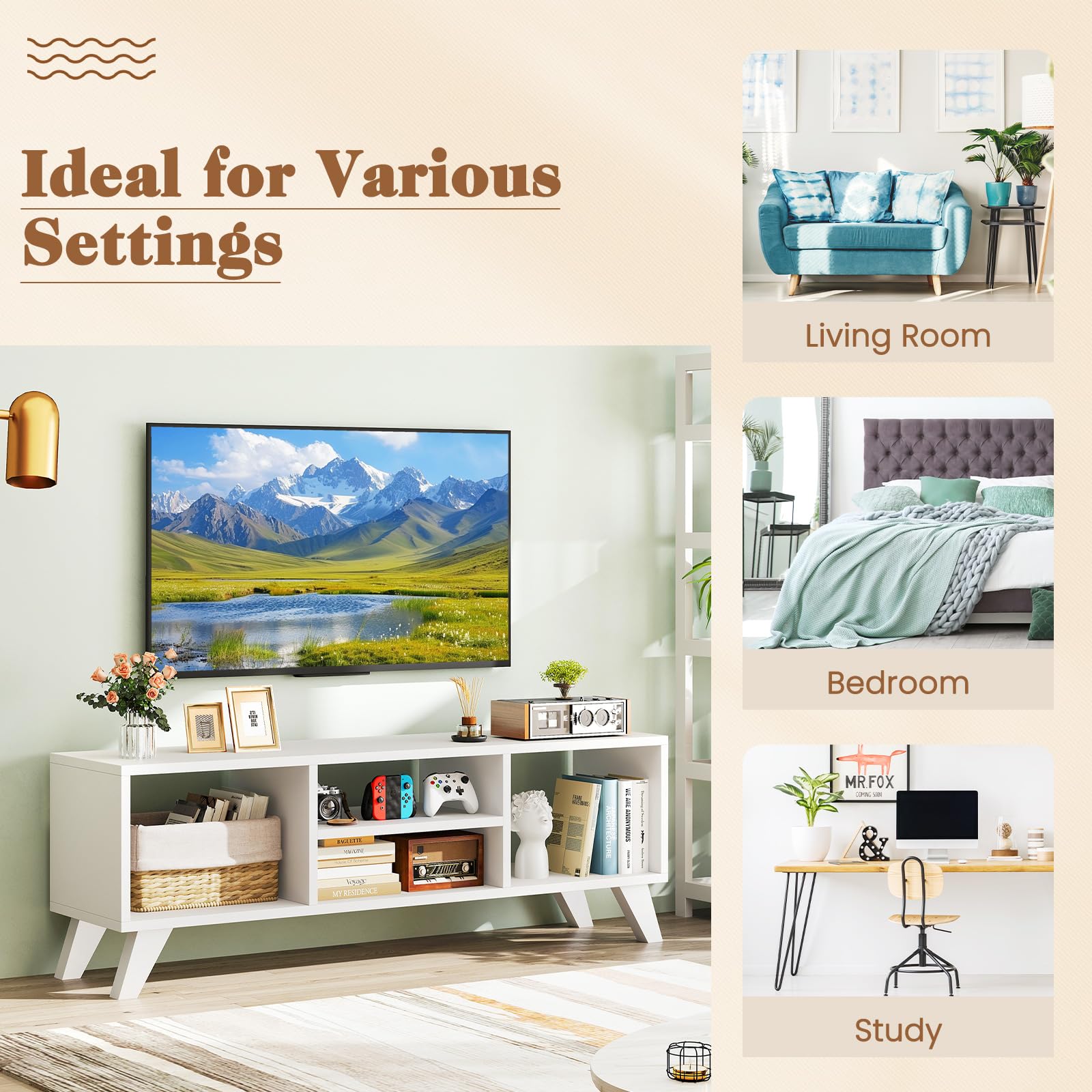White TV Stand for 55 Inch TVs with 4 Open Compartments