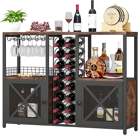 This multifunctional wine bar cabinet combines rustic charm with modern industrial design, perfect for wine enthusiasts and home entertainers. The mesh door design with magnetic self-locking provides visualization and ventilation, making it ideal as a wine cabinet, coffee bar station, storage cabinet, or buffet sideboard.