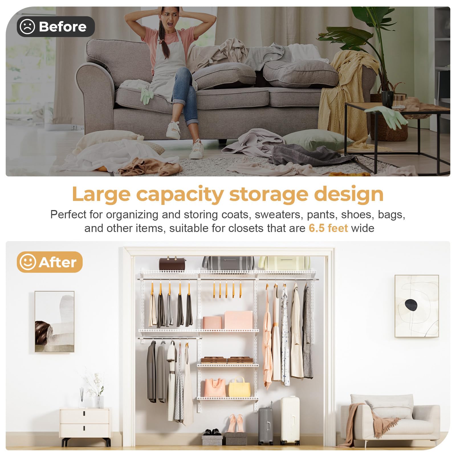 Transform your bedroom storage with this wall-mounted custom closet kit designed for 6.5 ft wide closet spaces. The modular design features adjustable hanging rods and shelves that allow you to easily organize clothes, shoes, and handbags while maximizing storage space.