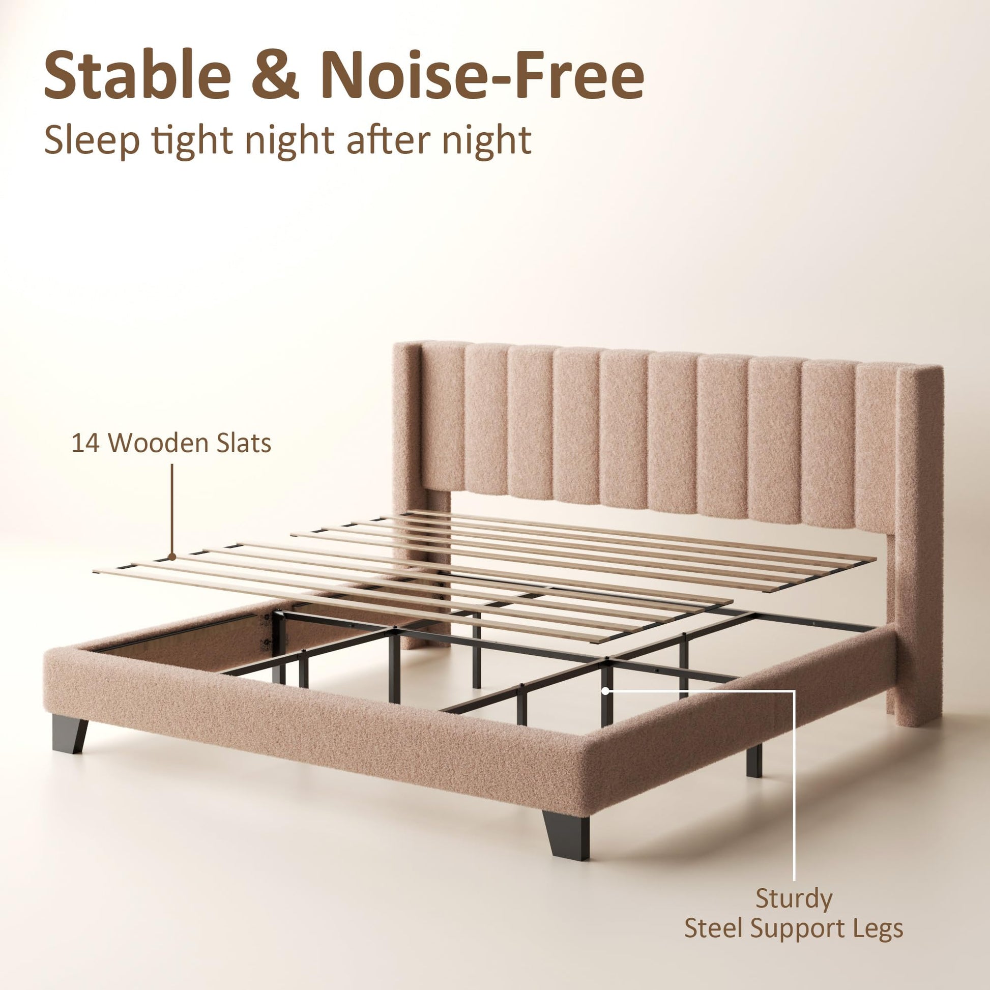 - Classic Style: Come with simple wing side style, channel headboard and skin-friendly teddy velvet fabric, this king bed frame is a stunning decor for your bedroom, create highly comfortable sleeping feeling.